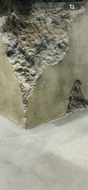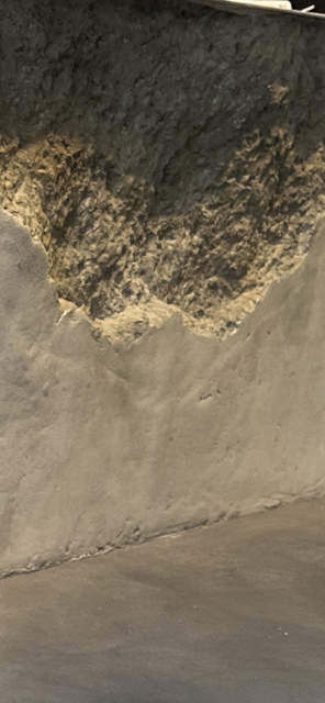 コンクリートをはつった様な仕上げを施工させていただきました。普段なかなか目にする事が出来ない『はつり』を表現するのに少し苦労しましたが、皆んなで知恵を出しあって、素敵な造形ができたと思います!!